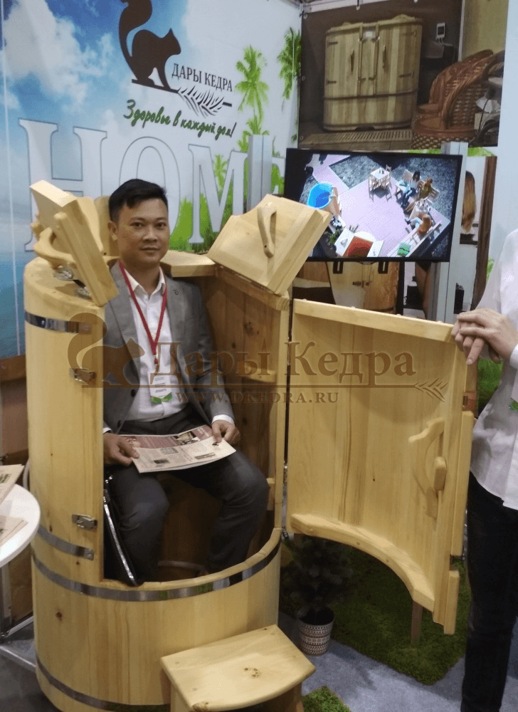 Это круглая фитобочка из кедра увеличенных размеров с толщиной стенок 45 мм. Подходит для людей высокого роста и крупной комплекции. Фитобочка оборудована откидными створками, дверцей и отверстием для головы. Верхний скос изделия делает положение головы более комфортным и улучшает обзор. Во время парения человек сидит внутри кедровой бочки, а голова находится снаружи. Благодаря этому исключается возможность перегрева. Подлокотники из кедра, встроенные ручки на створках и двери делают эксплуатацию более удобной.